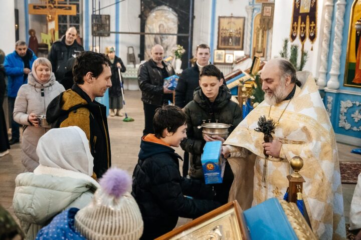 Настоятель вручил сладкие подарки в виде барашка, на коробках было написано «Рождественский агнец». Эти подарки достались детям, активным участникам группы «Надежный тыл» и активным прихожанам. Остальные радовались конфеткам.